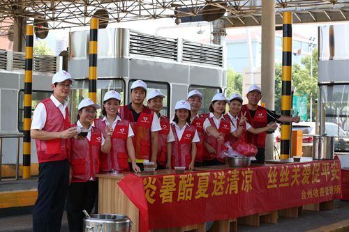 同日開始,臺州收費所組織志愿者開展“炎暑酷夏送清涼,絲絲關愛促平安”為主題的送清涼活動,所內黨員、入黨積極分子及業務骨干等20多名志愿者身著統一的志愿者服飾,在車道的安全島上拉起橫幅,搭起“便民服務臺”,免費向過往人員送上防暑藥品和所里食堂自制的綠豆湯、青草糊等解暑飲品,喝在口中,甜在心里,司乘人員紛紛贊不絕口。