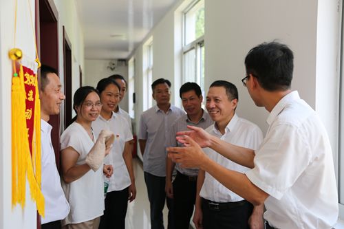 圖為集團總經理張建平在文明寢室流動紅旗前暢談
