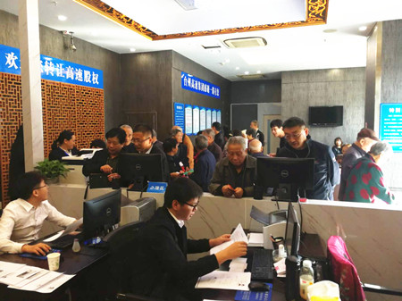 10月31日當天,全市各收購點股東絡繹不絕,股東轉(zhuǎn)讓熱情高漲,場面尤其火爆。當天下午,收購時間點過后,還有股東在收購點辦理轉(zhuǎn)讓手續(xù)。 李佩紅